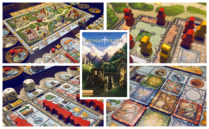 Azt hiszem, hogy a Monasterium kapcsán elsőként a tematika fogott meg. Mondhatni, hogy márpedig az mindennél unalmasabb és tán öreges is, mégis engem a mai napig el tudnak varázsolni ezek a kedélyesre hangszerelt történelmi témák. Azok, amiket a német grafikusok idestova tizenöt éve festenek már dobozokra és táblákra, kártyákra és tokenekre, és amik mögött az általában nem sok rokoni vonással rendelkező mechanizmusok húzódnak. Általában. Mert való igaz, hogy kevés a tematikus játék, még az olyanból is kevés van, ami legalább összedolgozik a rávetített képpel. Ilyen szempontból viszont a Monasterium kivételnek tűnt már az első látásra is. A sokat látott Dennis Lohausen által ügyesen felfestett világban, amelyben egy zöldellő tájon egymást érik a falatnyi kolostorok, ahol derűs szerzetesek piszmognak a napi teendőik felett, csupa olyan mechanikai elem kapott helyet, ami legalábbis igyekszik segíteni ezt a hangulatkeltést, próbál mindvégig a téma által meghatározott mederben maradni.