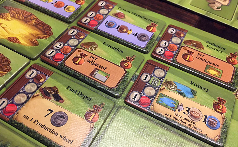 A felépítendő épületek három csoportba tartoznak, a kékek az „engine building” elemei, a sárgák azonnali, egyszeri jutalmat osztanak, a rózsaszínek pedig a játékvégi pontokat hozzák valamelyik paraméter mérésével.