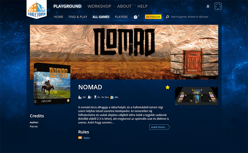 Végezetül még egy dolgot kért tőlem a Tabletopia: ha nyilvánossá teszem, ha nem, valamiféle kezdőoldalt kellett kreálnom a játékomhoz. Bannert és virtuális dobozképet, leírást és játékszabályt kellett feltöltenem ahhoz, hogy megnyugtatóan lezárhassam ezt a feladatsort. El kellett tehát határoznom magam, és mivel amúgy is sokszor itt volt a nyelvemen, Nomad-ra kereszteltem ezt az új jövevényt, a címoldalra egy („vangoghosított”) mongol lovas képét rittyentettem, és még valami egységes színvilág is kezdett kialakulni. A következőkre egy nagyon fontos sort írtam a to do listámra: értesíteni kell mindenkit, hogy elkészült az első virtuális társasjáték prototípusom, a vállalkozókat várom a tesztsorozat folytatásához.