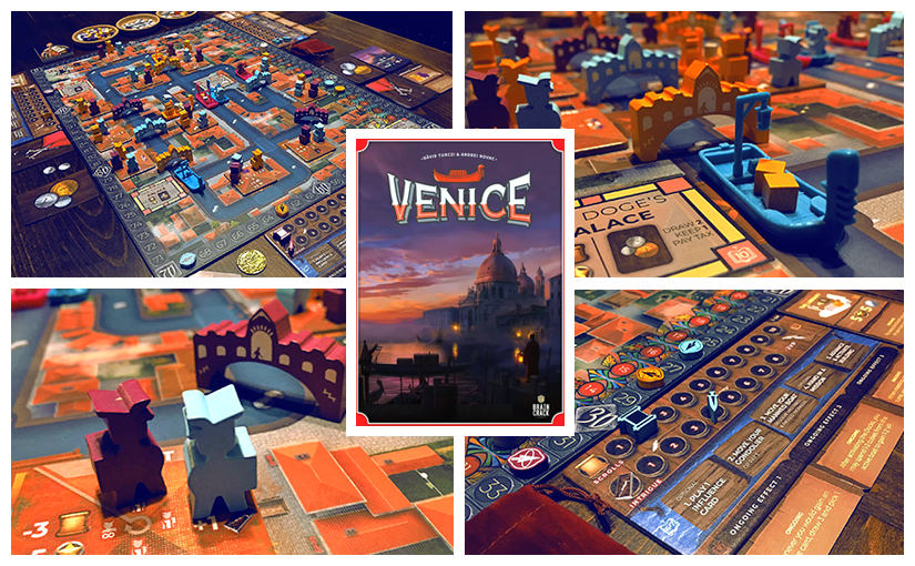 A Venice – a Ragusához hasonlóan – egy olyan egyszerű felépítésű játék, ami lényegében magán a játéktáblán játszódik. Épp ezért a legfontosabb játékelem a tábla és az ott megjelenő komponensek. A tábla nem túl nagy, talán pont a Ragusa táblamérete köszön vissza néhány olyan ismerős vizuális megoldással, mint a pontozósáv kivitelezése, a győzelmi pontok ikonjai, a függőleges elrendezés. Ezen túl más rokonító tényezőt (talán a nagyon könnyen görbülő, vékony, kissé csillogó kártyák kivételével) nemigen találtam a két játék között. Azonban amíg a Ragusa konkrét játékteréhez képest ott a táblaméret kissé talán túl nagynak bizonyult, a Venice esetén már a setupnál gyanússá kezd válni, hogy itt meg bizony túl szűk lesz. A táblára 12 négyzetes, négy részre osztott épületlapkát helyezünk fel véletlen sorrendben, ezen túl van néhány épület, amely fix funkcióval bír minden egyes játékalkalommal.
