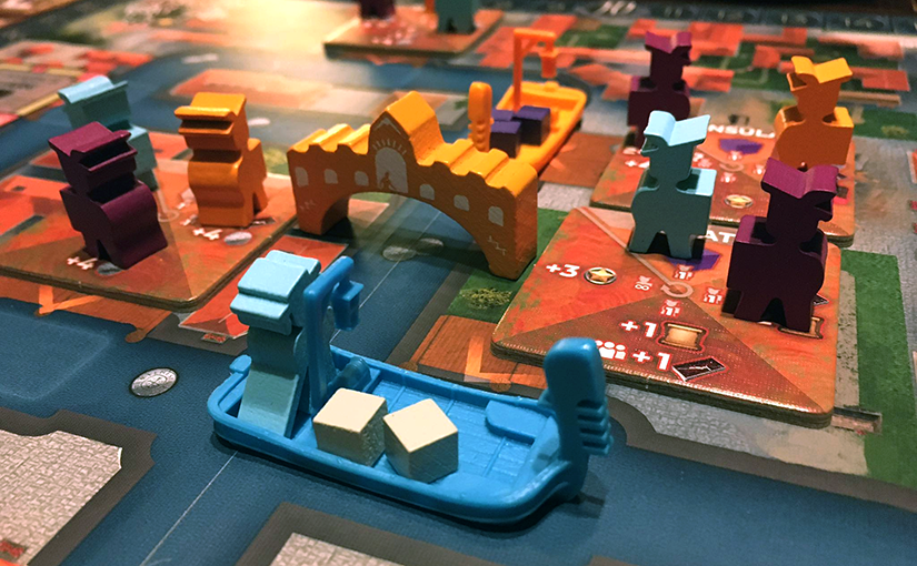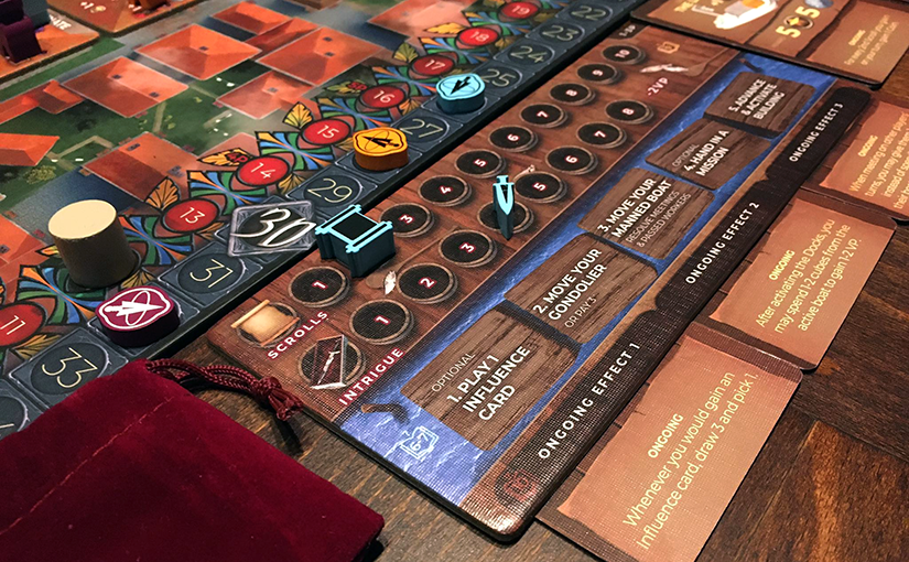 Gazdag kereskedők vagyunk tehát, rengeteg (10) ember dolgozik nekünk, két teherszállító gondolánk is van (amelyre legfeljebb 5 árukocka rakodható), de a súlyos munkaerőhiány miatt csak az egyikhez sikerült megbízható gondolást találni. Ezt a problémát a játék végéig nem sikerül, és nem is akaródzik megoldani, és ez biztosan nem pénzkérdés, ugyanis időközben komoly befektetéseket eszközlünk, sőt, fejenként akár 2-2 impozáns gyaloghidat is építünk a csatornák felett. Ezen komponenseken túl még jellemző ránk (az aktuális készpénzállományon kívül) a rólunk szóló gonosz pletykák és ármányok szintje (intrigue), valamint az ezzel korreláló tekercseké (ezek jelentése számomra végképp homályos). Ezeket a személyes táblánkon követjük nyomon, és ide helyezzük azokat a csak ránk vonatkozó képességeket is (küldetéskártyákat, amelyeket a táblánk alá csúsztatunk), amiket játék közben szerzünk.