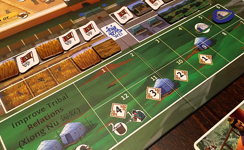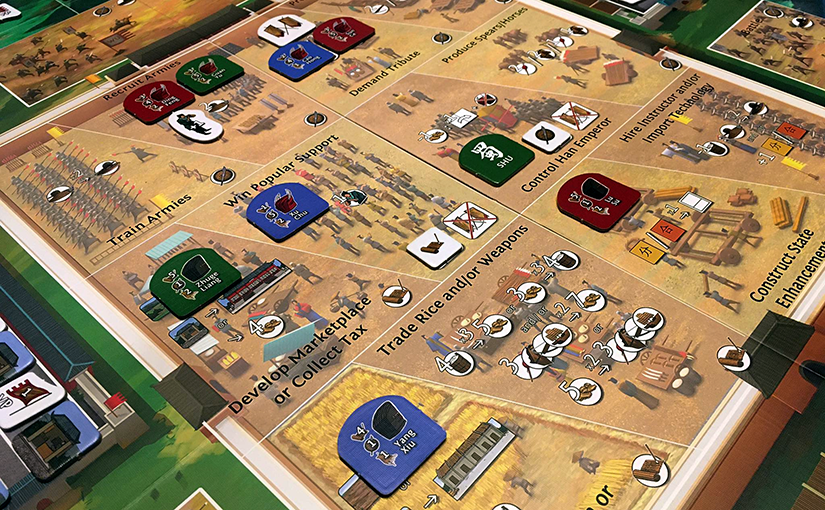 Van terület, ahol sereget toborozhatunk, vagy éppen kiképezhetjük ezeket a seregeket. Egy másik területen (pontosabban kettőn) beszerezhetjük a seregek fegyvereit, és bizony fontos szerepe van annak, hogy négy különböző fegyvernemmel operál a játék. Két terület – kissé nyakatekert módon – fejleszti a birodalom mezőgazdaságát, illetve adószedés révén folyamatos bevételhez juttathatja az uralkodót, amit jobbára a seregek ellátmányára költ el. De van itt terület, ahol polgári támogatókat szerezhetünk, vagy épp a császárt tudjuk befolyásolni, aminek révén emelkedünk a ranglistán, de egy fordulóra elveszítjük az egyik tábornokunkat, de szerezhetünk és kijátszhatunk képességkártyákat, vagy éppen kereskedhetünk, azaz bizonyos ráta szerint keresztbe cserélhetünk fegyvereket, rizst, aranyat. Nem nagyon fordul elő olyan forduló, aminél elkerülhető az érdekütközés, azaz nem ritkán az értékek méricskélése dönti el, hogy ki végez akciót.
