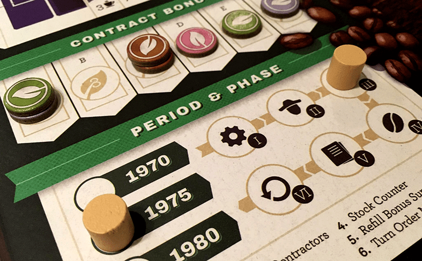Elsősorban az ő feladatuk, hogy végig vezessék a játékosokat a játékmeneten. A három időponthoz (1970, 1975, 1980) kapcsolódó 3 fordulónkban 6-6 fázist játszunk, és minden egyes fázisnak külön területe van a személyes táblákon. A hozzájuk rendelt mechanikák nagyobb része nem újdonság, de azért friss ötletekben sem mutat hiányosságot a Coffee Traders.