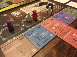 a központi tábla kínálatából. Ide kezdetben minden forduló elején 6 kerül a fentebb említett, meglehetősen puritán, hangulattalan négyzetes lapkákból. Egy zsákból húzzuk őket, azon belül egy, a kezdetekre és a parti második felére optimalizált „pakliból”. A kihúzott lapkák a táblán egy bizonyos belső sorrend szerint helyezkednek el, egyre növekvő árú lapkahelyeken. (Ezáltal egyes eseménytípusok hajlamosak mindig a drága zónába kerülni.) A megvásárolt lapka a személyes táblánk alá kerül az adott színnel jelölt sorba – így legközelebb már ez az esemény is megrendezhető a főurak számára. Ezek a lapkák szintén hoznak bónuszokat (és hála istennek nemigen visznek), azaz növelik az anyagi és a reputációs szintünket, és van győzelmi pont értékük is – sajnos nem ritkán negatív.