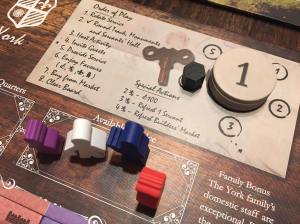Következő lépésként a személyes táblánk (azaz a birtokunk) mellett begyűjtött, helyszíneket és eseménytípusokat kínáló lapkákból kell választanom egyet, és azt a tábla mellől fel kell helyeznem magára a táblára (?). Figyelnem kell arra, hogy az eseményhez tartozó reputáció érték ne haladja meg a családunk jelenlegi szintjét (ezt, a közmegbecsülésünk állapotát mutató statisztikát egy nagyon kényelmetlen, körkörös indikátor segítségével lehet követni, valamint növelni, sőt csökkenteni is), illetve, hogy az eseményhez megfelelő számú és típusú személyt kell biztosítani a kezünkben lévő kártyákból, illetve az ő igényeik szerint