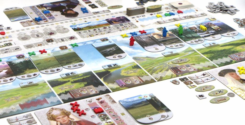 Talán gyorsan vegyük át, hogyan is működik a játék. A széltében elnyúló tábla 5 egymást követő régióra osztott. Ezekre összesen 12 tájlapka kerül (régiónként 2-3). Ezekre a tájlapkákra pedig 2-5 token véletlenszerűen, egy zsákból húzva. A zsákban 7 állattípus található, ezeknek típusonként 2 és 8 között van az „értéke”. (Azért tettem idézőjelbe, mert igazság szerint nincs valódi értékkülönbség, egyetlen részakciónál van csak ennek jelentősége mindennek, de mint majd a beszámolóm végére remélhetőleg kiderül, ez az apróság igenis meghatározó lesz sok esetben.) A játék során 4 nekilódulással mindig balról jobbra lépegetünk a lapkákon: ezzel szimbolizáljuk a család behatolását a kies Szibériába. Persze a lapok nem maradnak egy helyben, a tájakat „meg lehet venni”, és ettől telente elcsúsznak bal felé, tehát közelebb kerülnek a startpontunkhoz, valamint bármelyikre bármelyik állat felkerülhet, mint potenciális préda (ez nem élőhelyfüggő), és akár nyáron is felkereshetünk téli tájat, a kietlenebb helyeken is lehet sűrűbb a fauna stb.