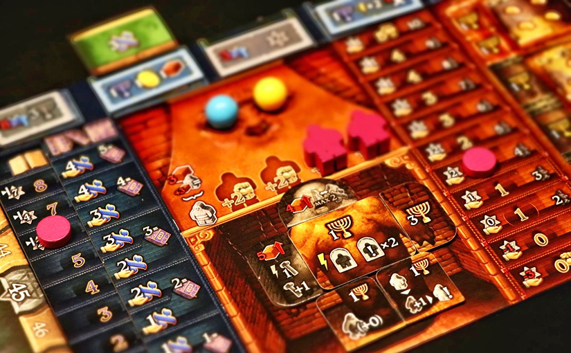 és ezt hála istennek elkerülik a játékosszínek (de sajnos nem úgy a könyvkártyák, amelyek hasonlókép színezettek, miközben tartalmi szempontból nem kapcsolódnak az egyes területekhez). A játék végén egész pontosan maximum 32 (illetve egyetlen játékos számára akár 36) pont írható minden egyes területből a személyes tábláján. Természetesen a három terület szintén a piros-kék-sárga színeket kapta. A kék a tudást, a könyveket, ezáltal az aleph jelölésű nyersanyagot, valamint a kártyán kapott lehetőségeket priorizálja, a piros a gólemek építésére fókuszál, ott az újonnan épített szörnyetegek munkába állítása és fejlesztése a cél, a sárga terület pedig az arannyal működtetett(?) négy elvont gépezet területe, amely elsőként a fordulónkénti bevételeinket dúsítja. A játék végén a pontjaink oroszlánrészét az egyes (piros-sárga-kék) területek fent említett kulcselemeinek (könyvkártyák, gólemek, gépezetek), valamint a fejlesztéseik (megfordított lapkák) által nyert menóra ikonok szorzata adja. Mivel mindhárom területen 4 kulcselem, valamint legfeljebb 8 menóra érhető el, a 32 pont a maximum, azonban a táblán valaki elvehet 1-1 menórát az egyes színekben, így számára még egy szorzó is elérhető.