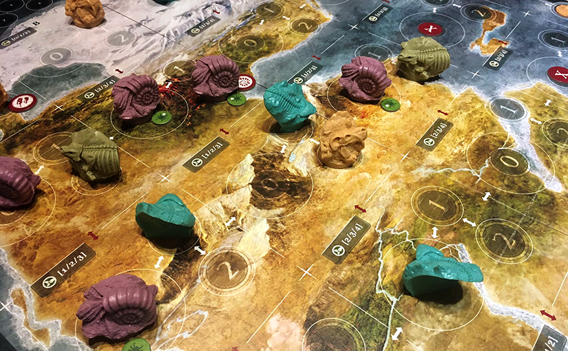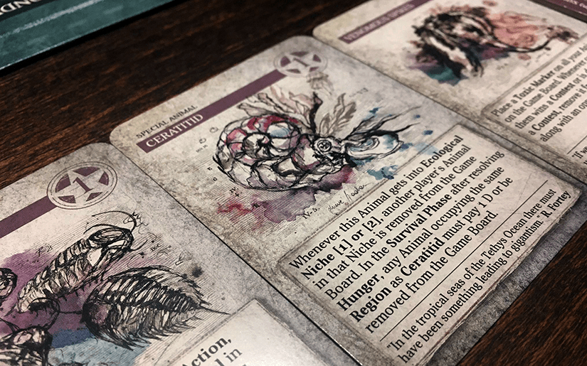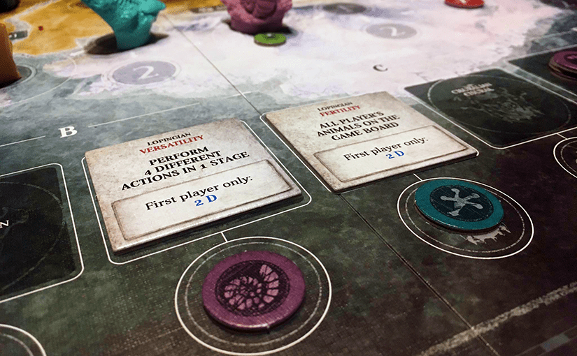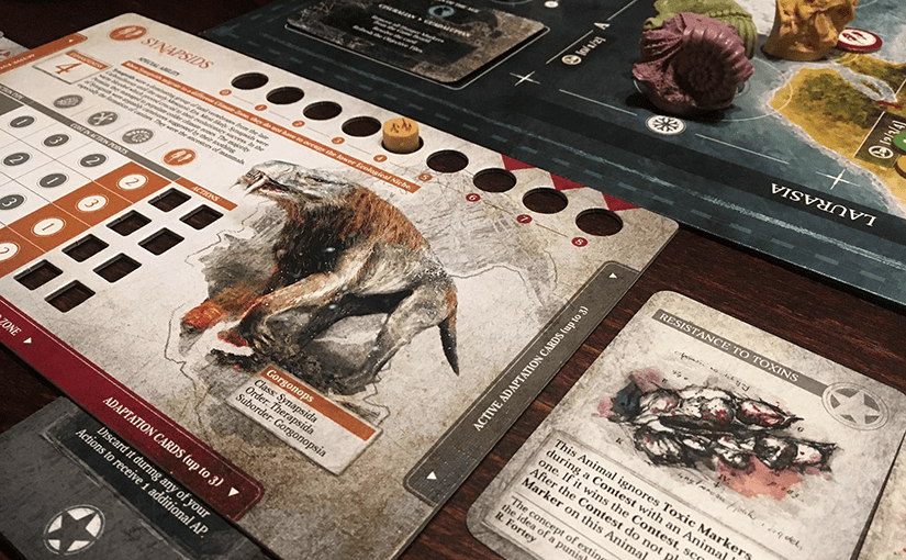 Az alkalmazkodás és a fejlődés tehát kártyák által történik (az 1. számú akció a kártyák kijátszását teszi lehetővé): amíg az első átmeneti, egyszer használatos, sőt, akár a fejlődésért (egy evolúciókártya aktiválásáért cserébe) eldobható, a másik permanens és egyenesen lecserélhetetlen. A kártyák kezelését kifejezetten nehézkesnek, de megszokhatónak találtam, és ez az elem az, amelynél előfordultak vitatott értelmezések, meg lázas szabályfüzet lapozgatások is – még a harmadik játékalkalommal is. Pedig a kártyák végül elég egyértelmű célokat szolgálnak, és nagyon hasonlókat is egyben, csupán a részletek különböznek épp annyira, hogy könnyű legyen félreérteni azokat.