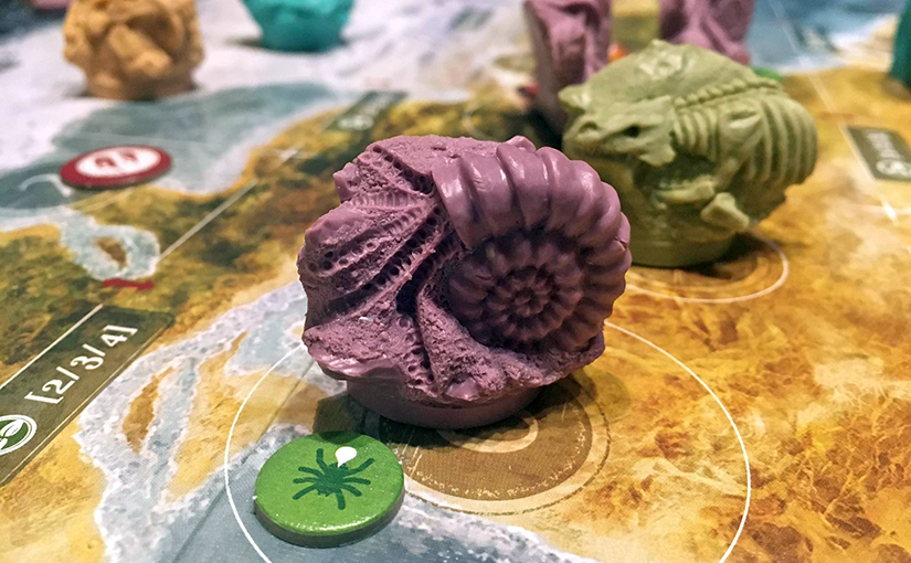 A vizuális egységhez a játékosszínekhez igazodó, egyszerű kartonkorongok és elegáns, áttetsző jelölők tartoznak, amelyeket – az alkotás komolyságával együtt – némiképp felborít a Kickstarter kiadáshoz mellékelt műanyagarzenál. A plasztik alternatívák nem csak nem szebbek, mint az eredeti elképzelés szerinti komponensek, de nem is mindig vannak tekintettel a játszhatóságra (ahogy ez nem is egyszer előfordult már). A miniatűr állatjelölők a kelleténél sokkal nagyobbak, ráadásul mind valamely fosszilis formájában mutatja az adott élőlényt – mindezt abban a korban, amikor még javában élt és virult. Más jelölők nem helyezhetők egymásra könnyen, vagy épp a verzójuk nem működik a szabálykönyvben leírtak szerint. A végső kataklizma eljövetelét jelző földgömb a becsapódó meteorral kétségtelenül látványos, de mivel a játék fő kérdése éppen az, hogy miféle katasztrófa válik végül végzetessé, hogy úgy mondjam, ez az elem sem tölti be a funkcióját maradéktalanul, csupán mókusvakításként értékelhető. Mindazonáltal a társaságunk beszavazott néhány KS-megoldást a játékba – ha már Walkó Gergő jóvoltából egy ilyen deluxe változat került hozzánk (ez úton is köszönöm neki) –, de bizonyos elemeknél végül maradtunk a sztenderdeknél.