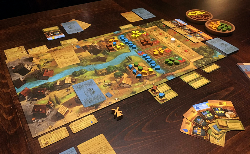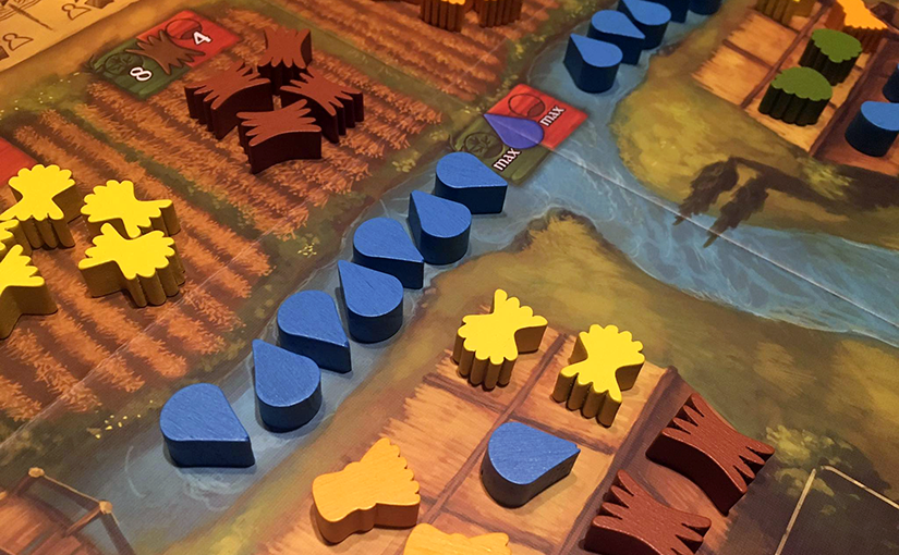 A tábla közös területeit tehát a vízforrást jelképező folyó, a négy termőföld, egy kártyáknak fenntartott ugarterület, valamint egy naptárfunkciót betöltő papírtekercs teszi ki. Az utóbbi egyben a fordulójelölő is. Hat esztendőn át megy a versengés (és az egymással való incselkedés egyben), majd eljön az utolsó kupa sör ideje – talán épp ezt látjuk a címlapon. Minden páratlan év gyümölcsözőbb ezen az éghajlaton, és bizony minden páros kissé ínségesebb. A különbséget egyetlen dolog jelzi igazán, de az legott karakterévé válik az adott esztendőnek: a kártyák kijátszásának módja.