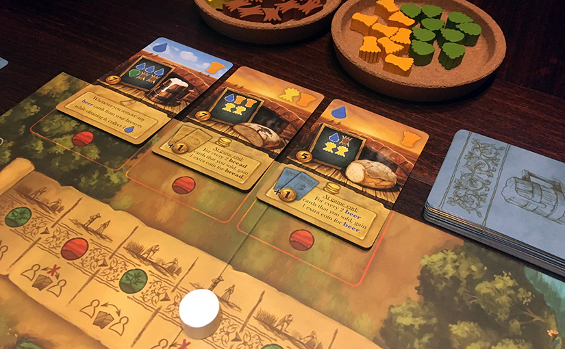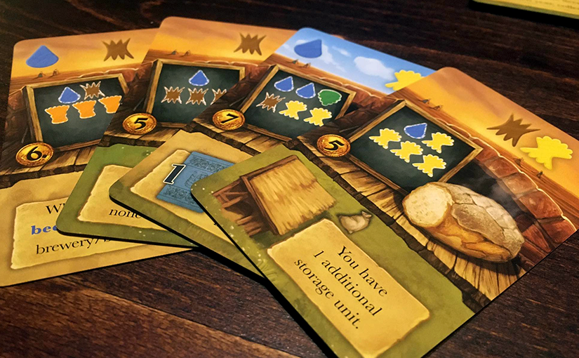 Öt olyan kártya van a kezünkben, amely 3 különböző funkcióval rendelkezik. A felső harmadban néhány ikon azt mutatja, hogy ha a kártyát a betakarítás részeként játszom ki (magam elé), az adott nyersanyagokat vehetem el a közös területről. A középső harmadban egy kvázi recept található, azaz, hogy egy adott sör- vagy kenyérfajta milyen összetevők által készíthető el (ha elkészítem, a kártyát a serfőző vagy a pékség épületére kell leraknom). Az alsó traktusban pedig egy-egy szövegesen-ikonosan megfogalmazott képesség olvasható, amely akkor lesz az enyém, ha a lapot épp eddig, az utolsó harmadig a tábla felém eső szakaszán becsúsztatom a megfelelő (játék végi, a betakarításra, a készítésre vagy a raktározásra stb. vonatkozó) funkció ikonja alá.