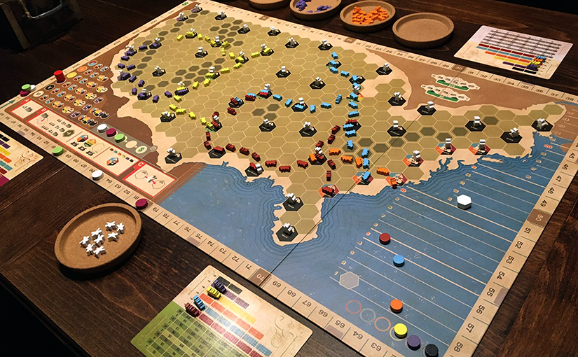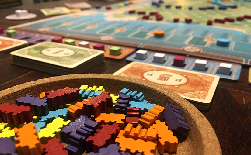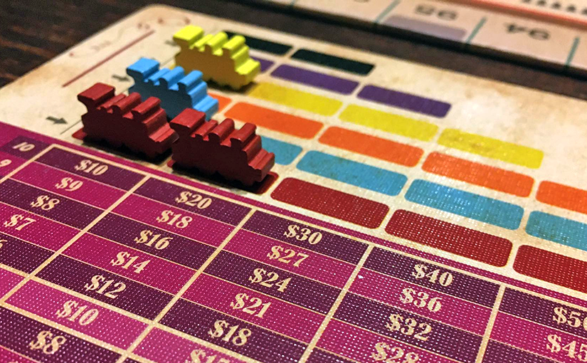 A harmadikként az asztalunkra kerülő Ride The Rails immáron Harry Wu (akiről már tudjuk, hogy nem más, mint John Bohrer) munkája, és szintén egy nagyjából egy órásra összezsugorított 18xx származékot kínál. Nagyon érdekes látni, hogy Bohrer mennyire másként nyúl ehhez az egyszerűsítési folyamathoz. Ezúttal minden forduló első akciójaként egyszerűen hozzájutunk (elveszünk egy tetszőleges színű mozdonyfigurát a tábláról) egy részvényhez. Aztán minden új fordulóban újabb és újabb lehetőségek nyílnak – mások meg becsukódnak, mert a hálózatépítés során egyszerűen elfogynak a mozdonyok, amelyek egyben a részvények jelölői is.